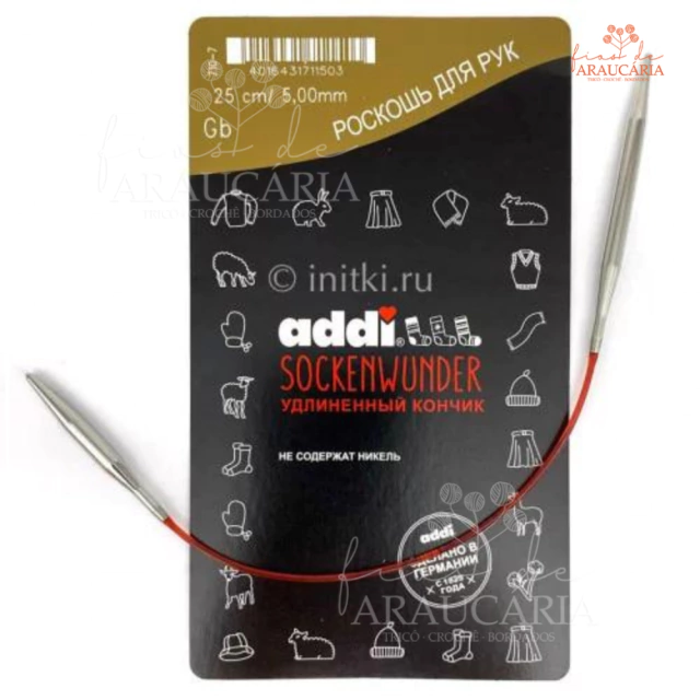 Agulhas circulares fixas, ideal para fazer meias e pequenas circunferências. Cada agulha possui tamanhos diferentes e o comprimento total delas, com o cabo, é de 25cm.