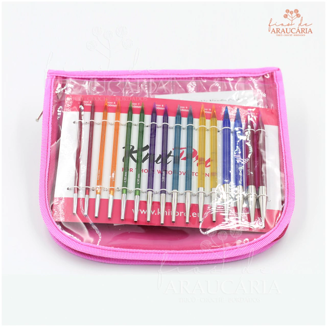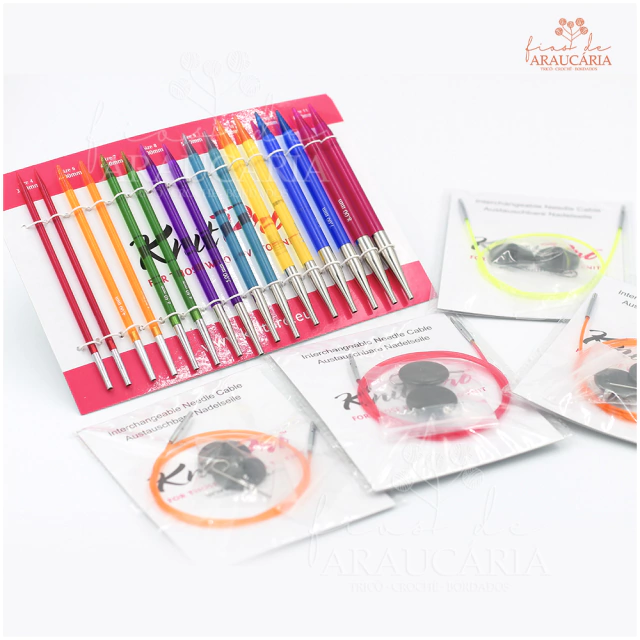 Kit de agulhas de tricô circulares intercambiáveis de acrílico Trendz. Pontas lisas e afiladas. Nesse colorido estojo contém: