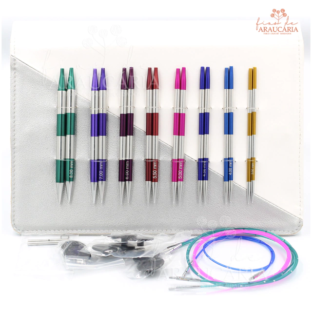 Kit especial e atraente de agulhas de tricô circulares intercambiáveis de alumínio longas Smartstix. As agulhas e os cabos contém marcações coloridas em intervalores de 2cm, para que você possa medir os trabalhos em qualquer lugar. Nesse lindo estojo branco e prata contém: