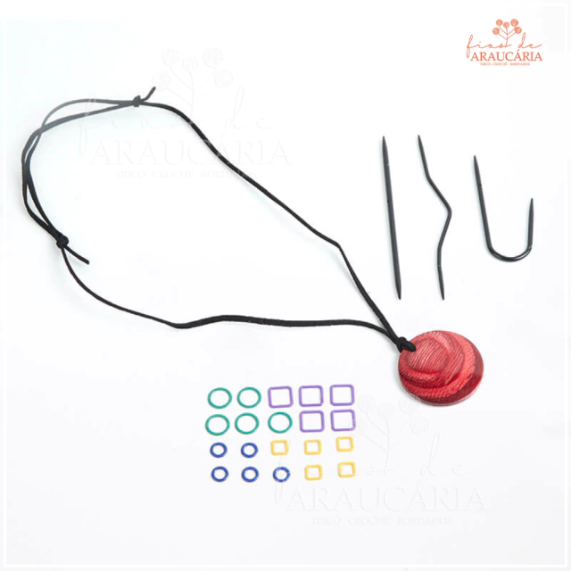 - 03 agulhas de trança, sendo: 01 colher central 2,5mm, 01 gancho "J" 3mm, 01 ponta dupla 3,5mm