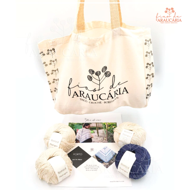 Kit com a Receita criada pela designer Iris Alessi (@flordeiris_handmade). Essa receita pode ser executada por tricoteiras iniciantes curiosas e por experts.. Pensado para ser usado nas épocas menos frias do ano, Porto é um xale leve. Tecida com fio de seda, sua trama é praticamente toda feita em cordões, mas conta com detalhes de bolinhas (bobbles) numa segunda cor contrastante que dá um charme todo especial para a peça.