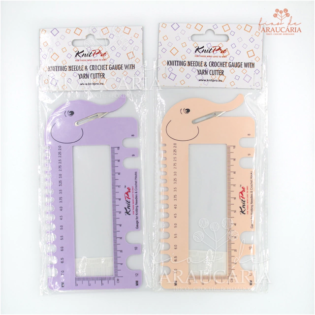 Régua multiuso para medir amostras de pontos e identificar agulhas de crochê e Tricô. Possui também um eficiente cortador de fios.